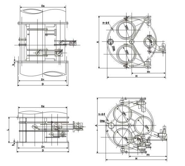 閥組型號 | D | D1 | L | b | n-Φd | A | A1 | H | H1 | 閥門配制 | 許用流量(m3/h) | 重量(kg) | 對應管道 |