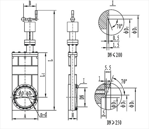 型號(hào) | 通徑(DN) | ΦD | ΦD0 | ΦD1 | ΦD2 | ΦD3 | H | A | n-d | L | L1 | B | 法蘭標(biāo)準(zhǔn) |
